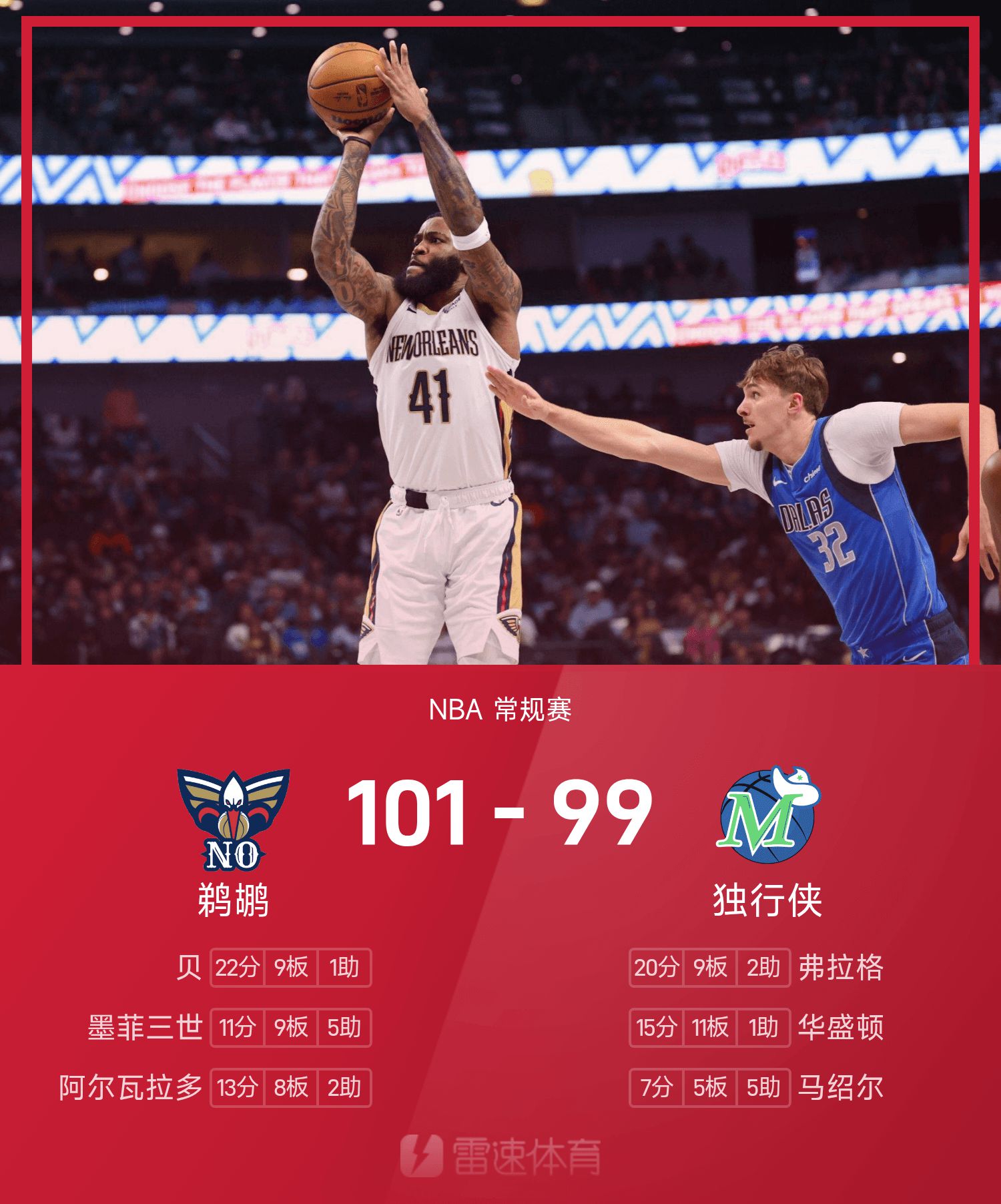 NBA战报:贝22分9板&弗拉格错失绝平,鹈鹕101-99独行侠