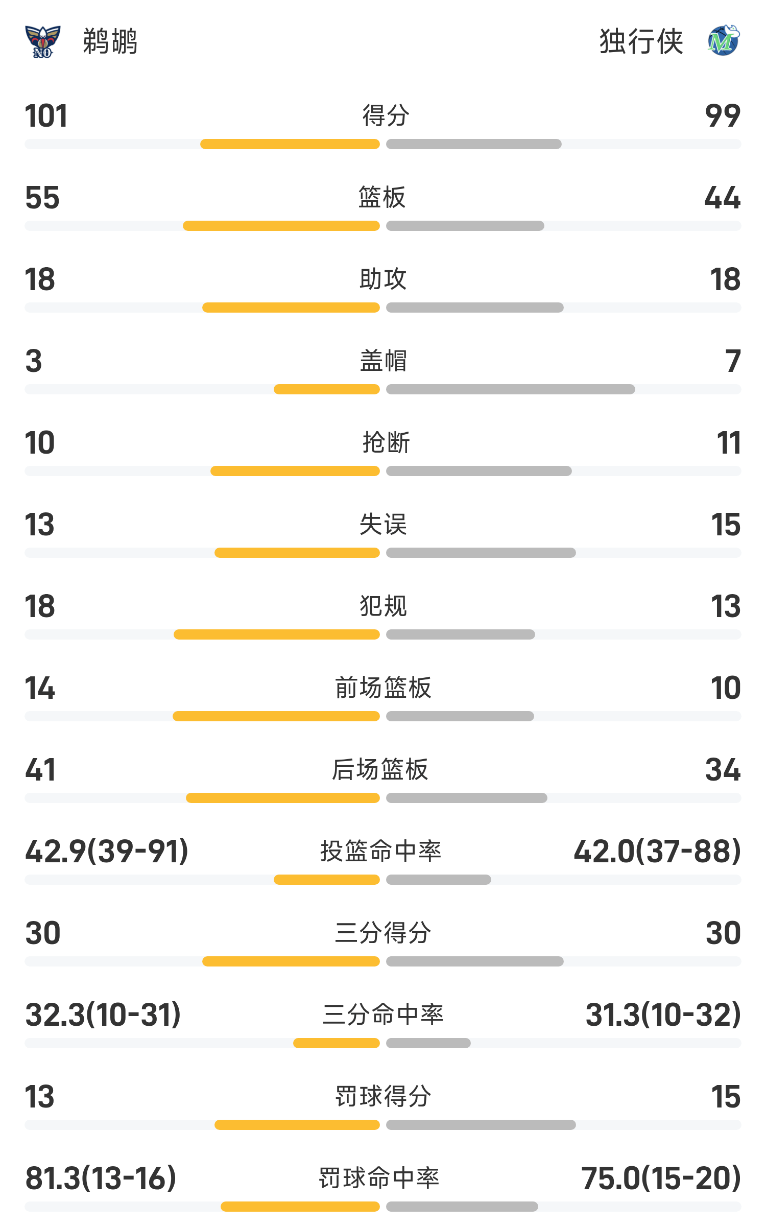 双方全场战罢,独行侠99-101不敌鹈鹕。