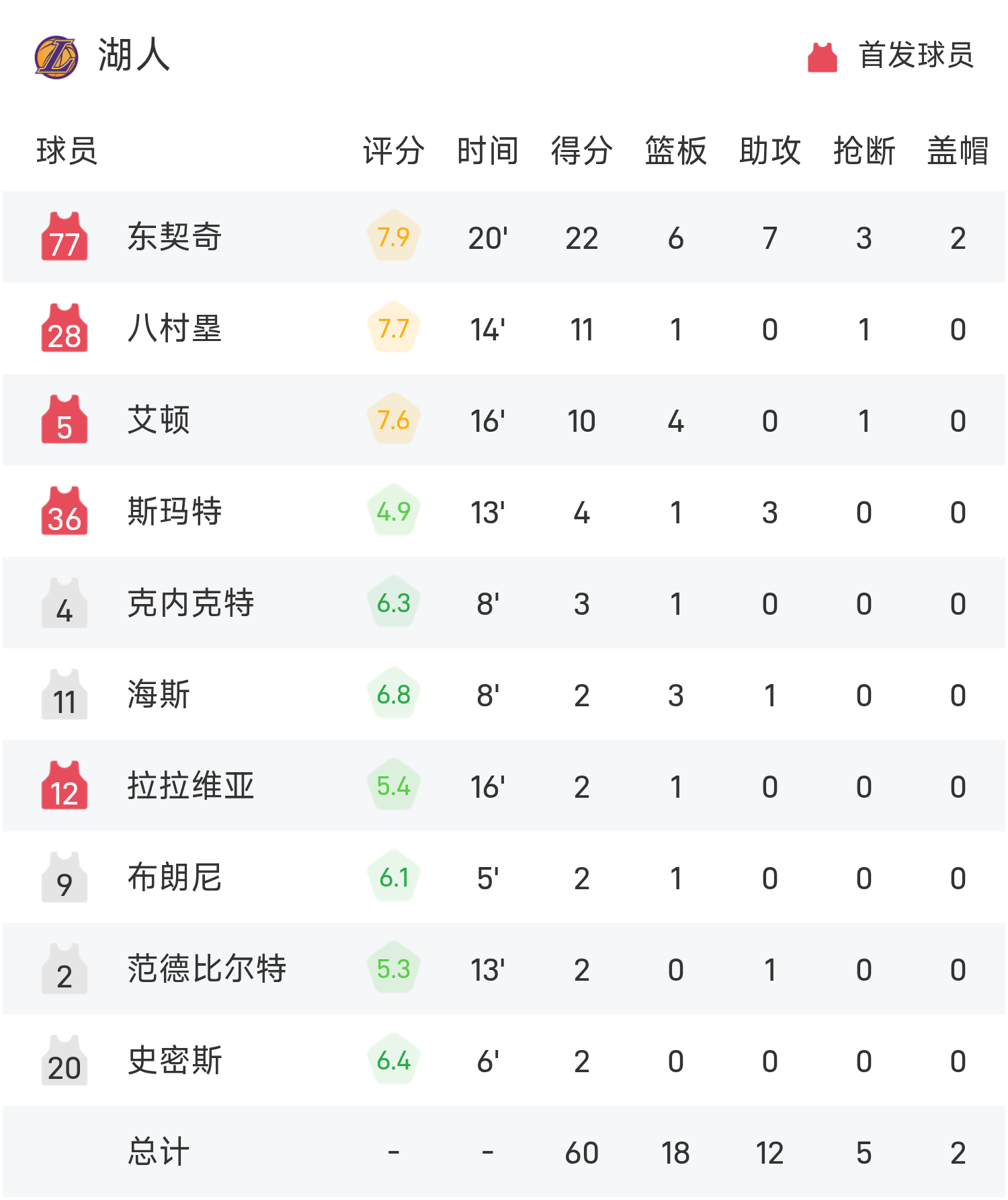 NBA半场:东契奇22分6板7助,湖人60-59马刺