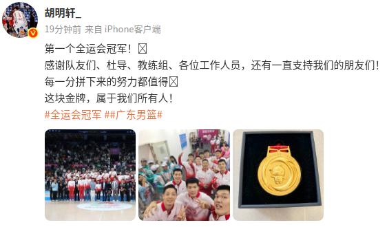 6686体育官网11月13日讯 全运男篮总决赛,广东队击败浙江队,获得冠军,赛后,胡明轩在社媒发文分享自己的感想。