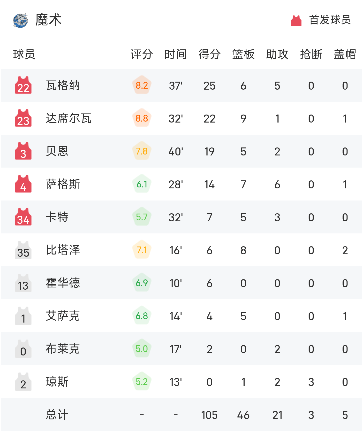 瓦格纳砍下全场最高的25分6板5助,率领魔术胜利取胜。