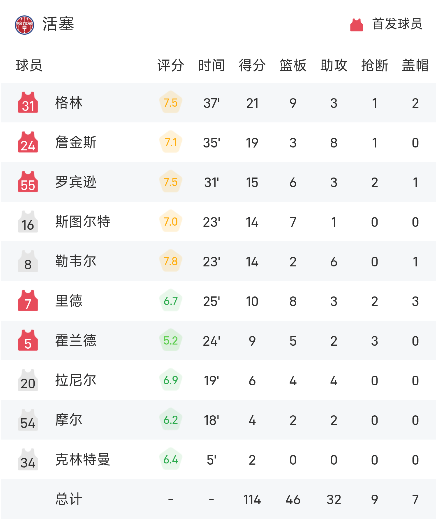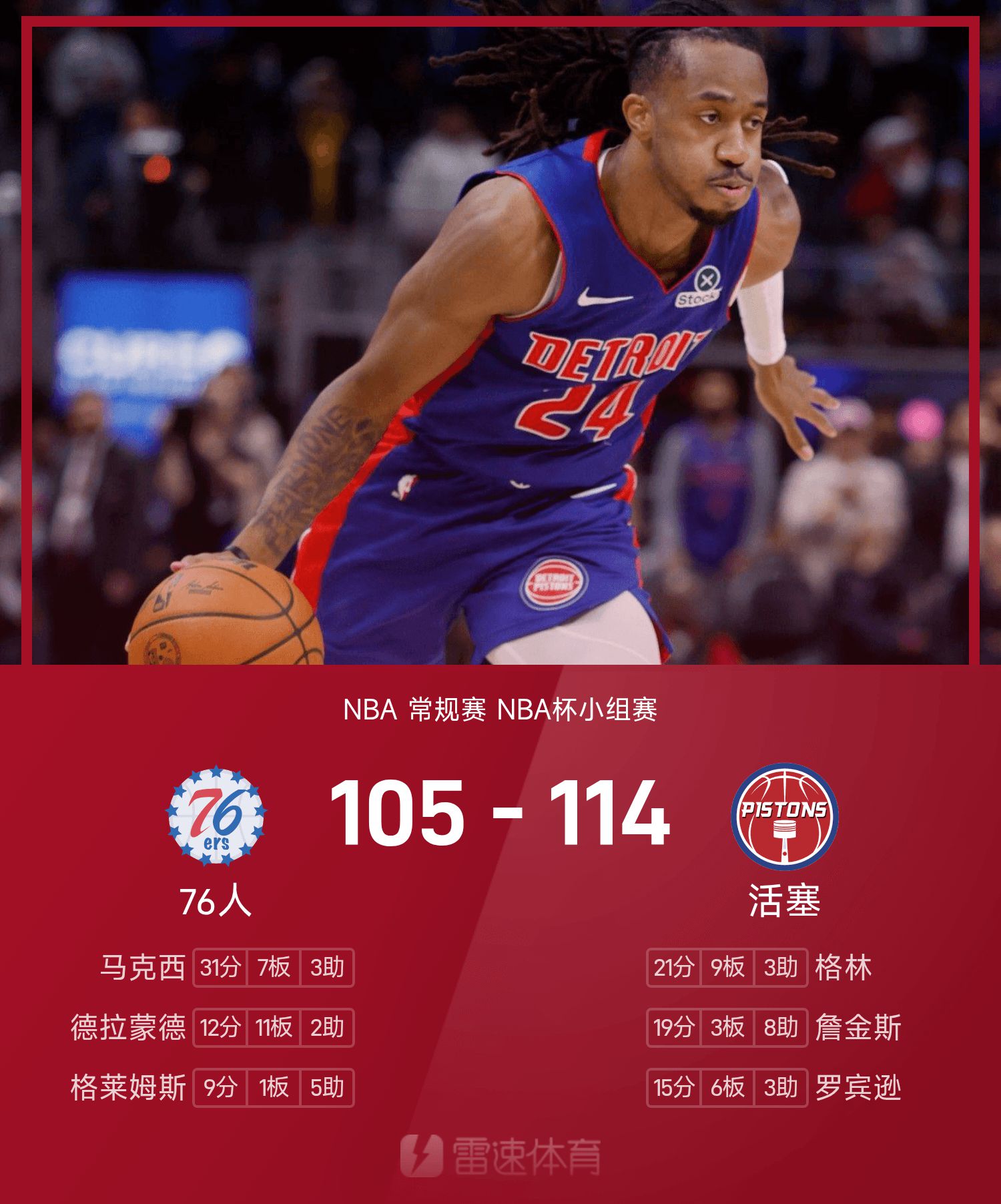 NBA杯战报:詹金斯19分8助,活塞114-105击败76人