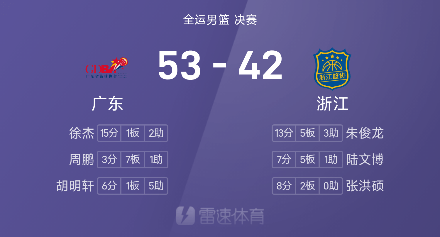 全运男篮总决赛半场:朱俊龙13+5,徐杰15分,广东53-42浙江
