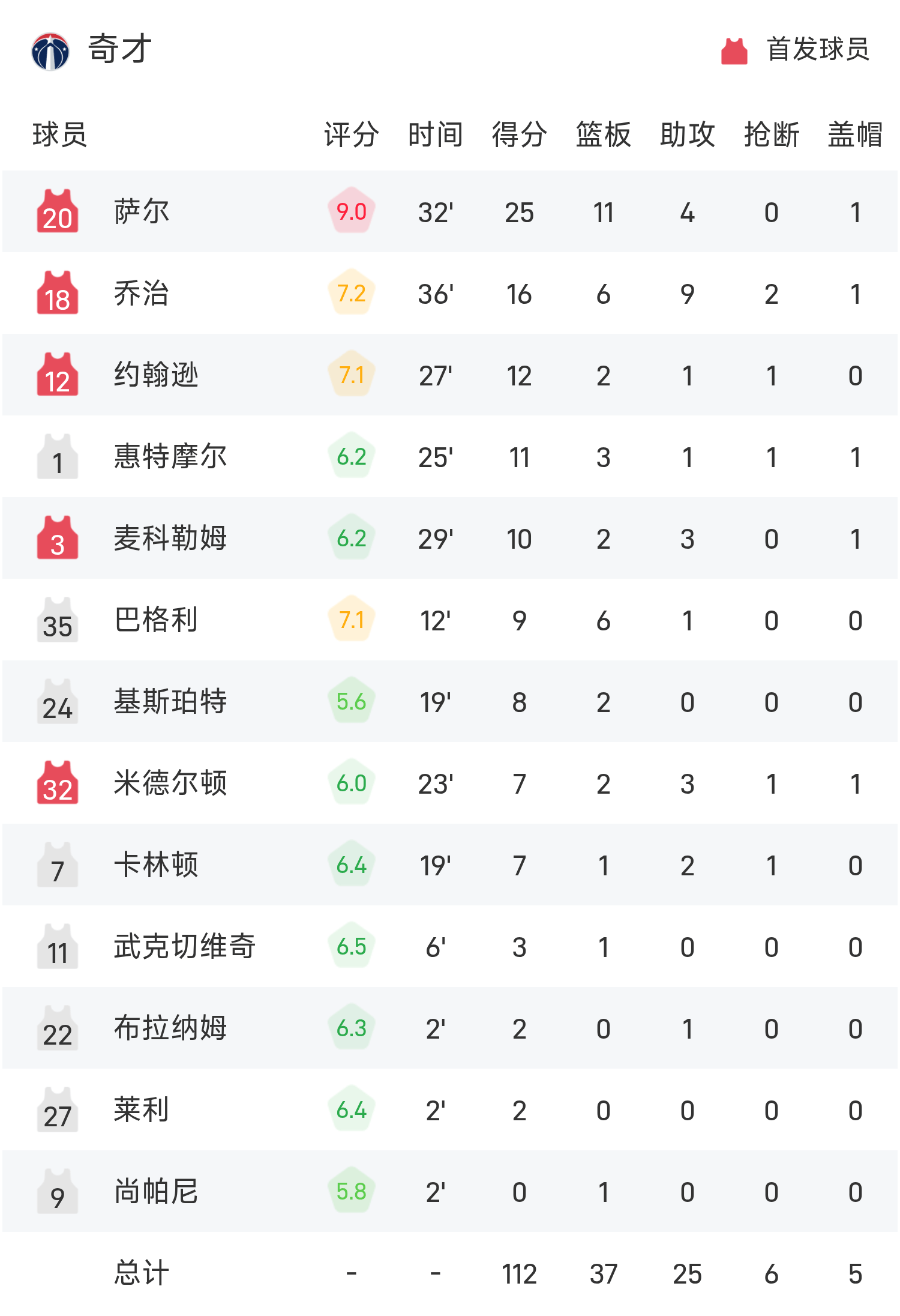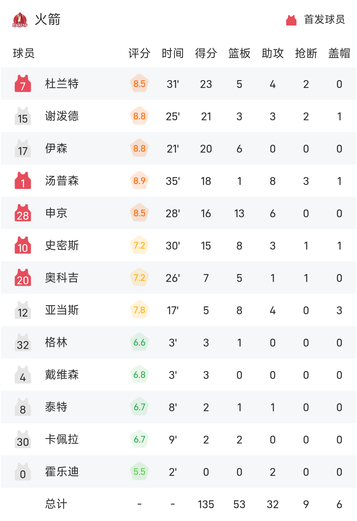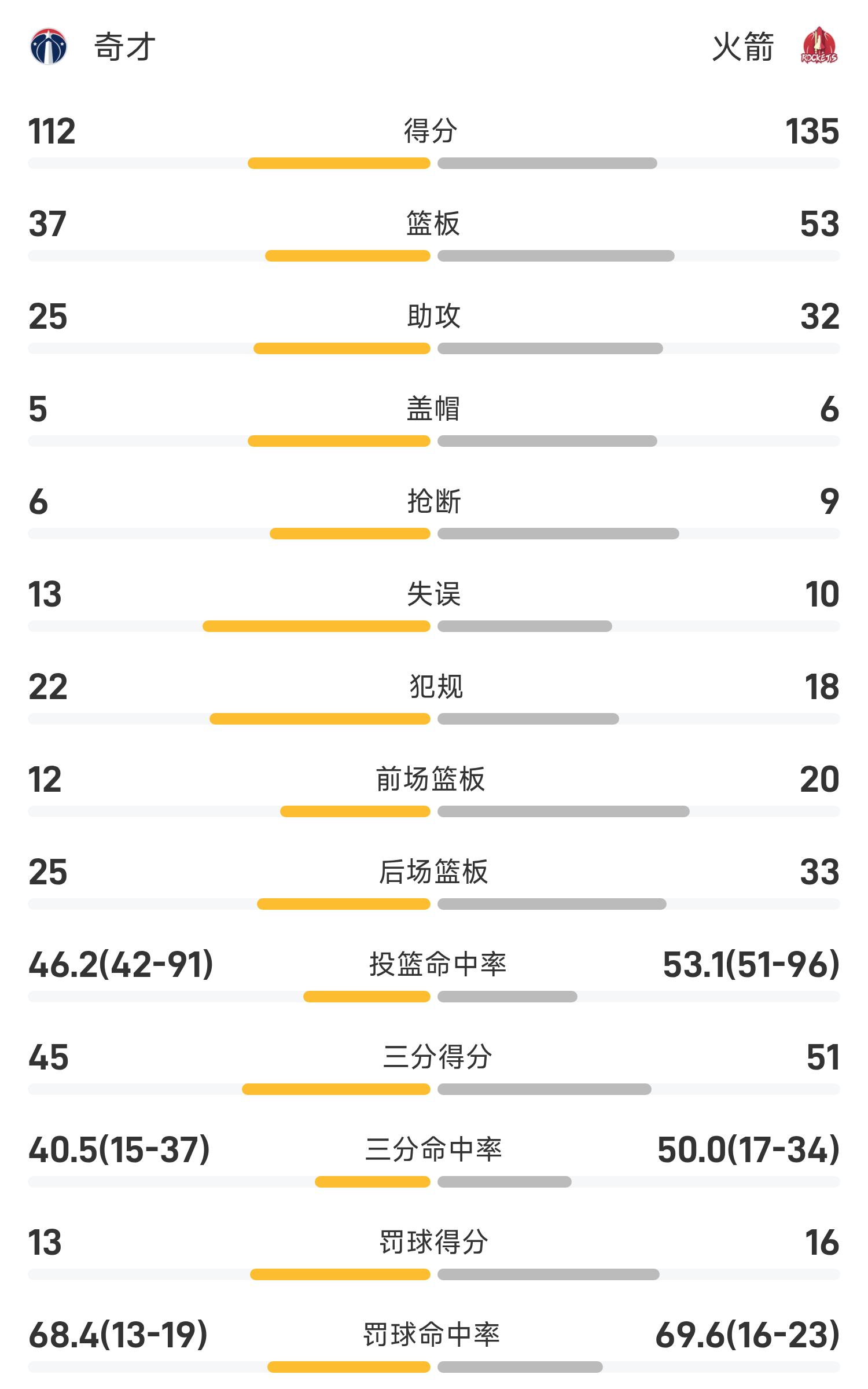 双方全场战罢,火箭135-112战胜奇才。