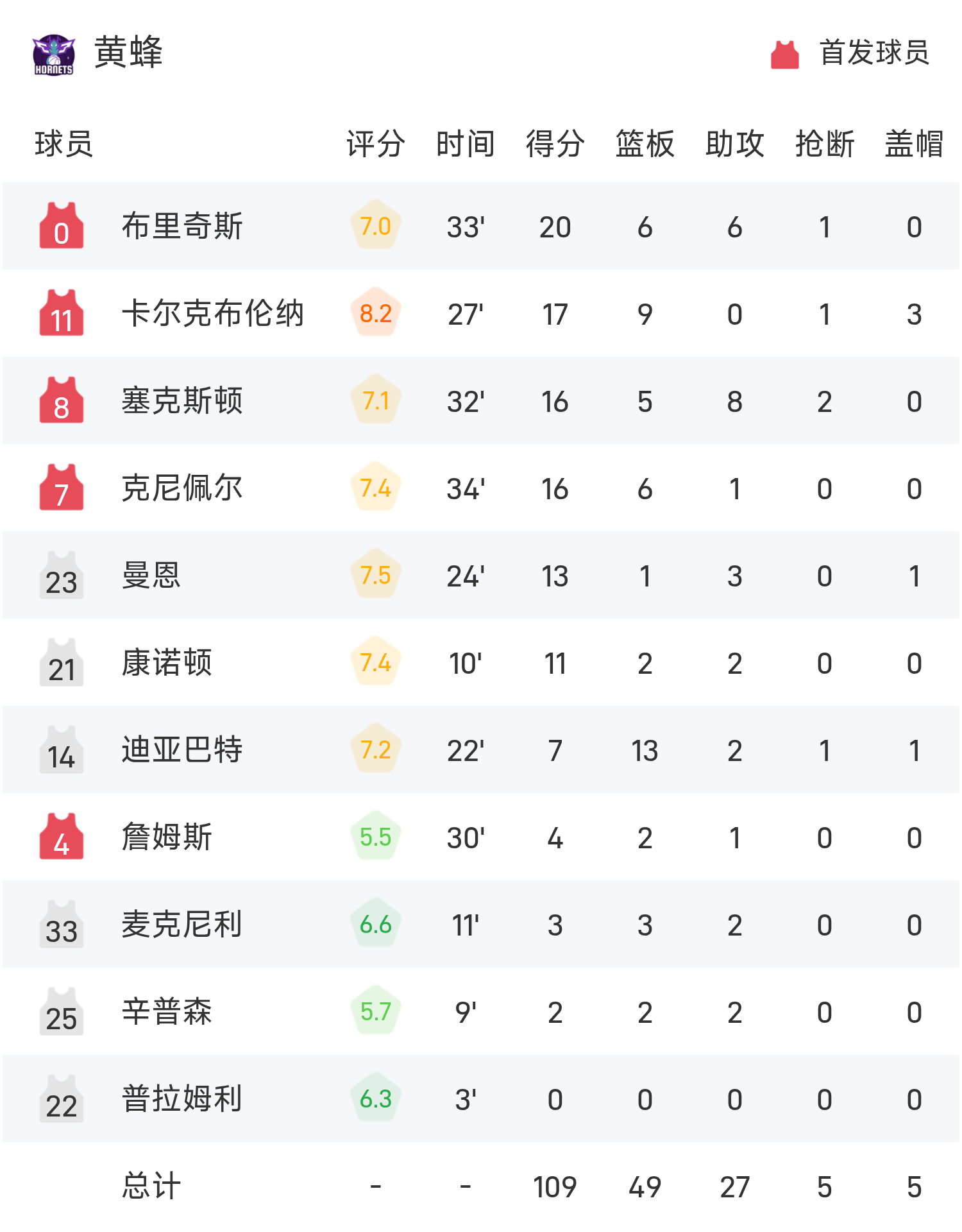 布里奇斯得到20分6板6助率队取胜,罗林斯空砍全场最高的25分5板6助。