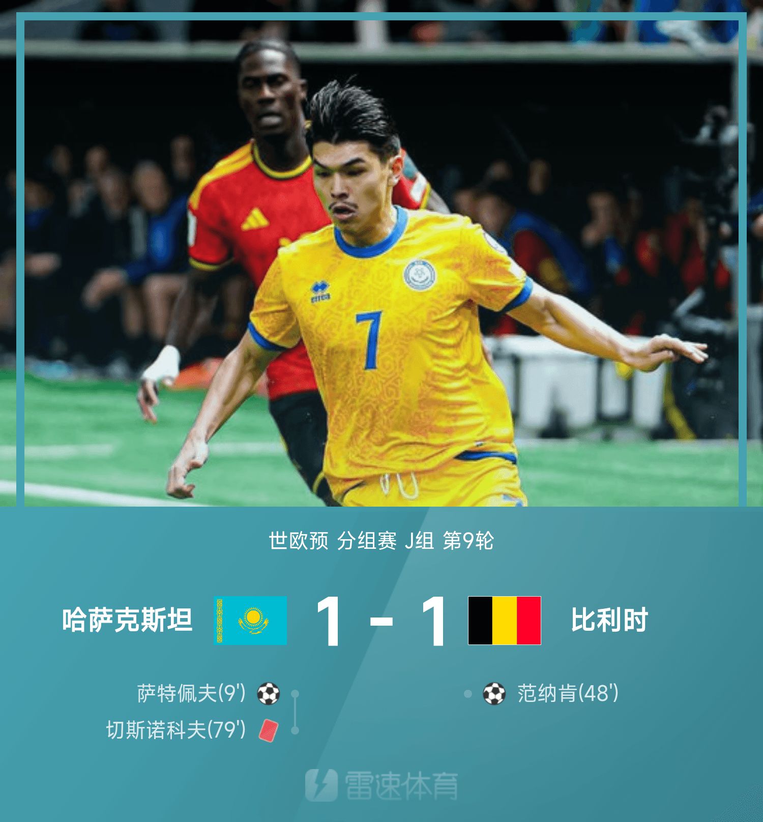6686体育官网11月15日讯 26赛季世欧预分组赛J组第9轮,哈萨克斯坦1-1战平比利时。上半场竞赛,萨特佩夫抓住泰特差错机会单刀破门,下半场范纳肯顶球破门扳平赛果分,随后比利时发起猛攻,切斯诺科夫蹬踏染红,但1-1的赛果分保持到终场,比利时无缘提前晋级世杯赛。