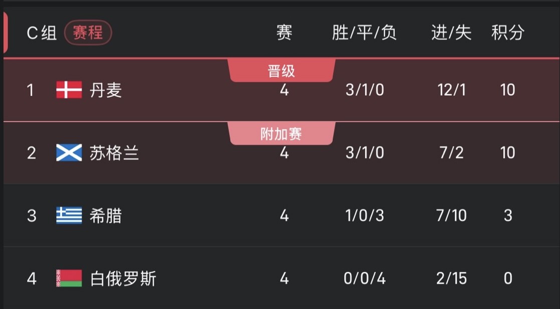 丹麦与苏格兰同分,两队将在最后一轮于格拉斯哥展开直接交锋,争夺小组头名。