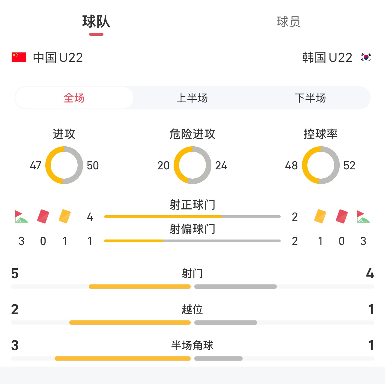 U22中国vs韩国U22全场数据: