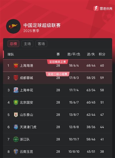 中超争冠形势:还剩2轮海港蓉城申花仅差2分,国安彻底掉队
