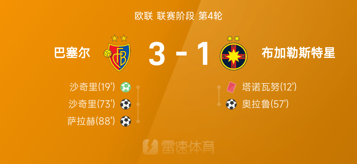 欧联战报:沙奇里梅开二度,巴塞尔3-1战胜布加勒斯特星