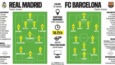 6686体育官网10月26日讯 西甲第10轮将迎来万众瞩目的西班牙国家德比,皇马将坐镇在主队场迎战巴萨。西班牙媒体《每日体育报》预测了双方本场竞赛的首发阵容。