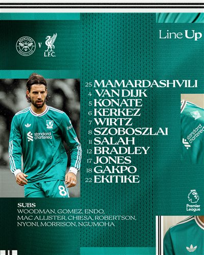 利物浦首发:25-马马尔达什维利、4-范戴克、5-科纳特、6-凯尔凯兹、12-布拉德利、8-索博斯洛伊、17-琼斯、18-加克波、7-维尔茨、11-萨拉赫、22-埃基蒂克